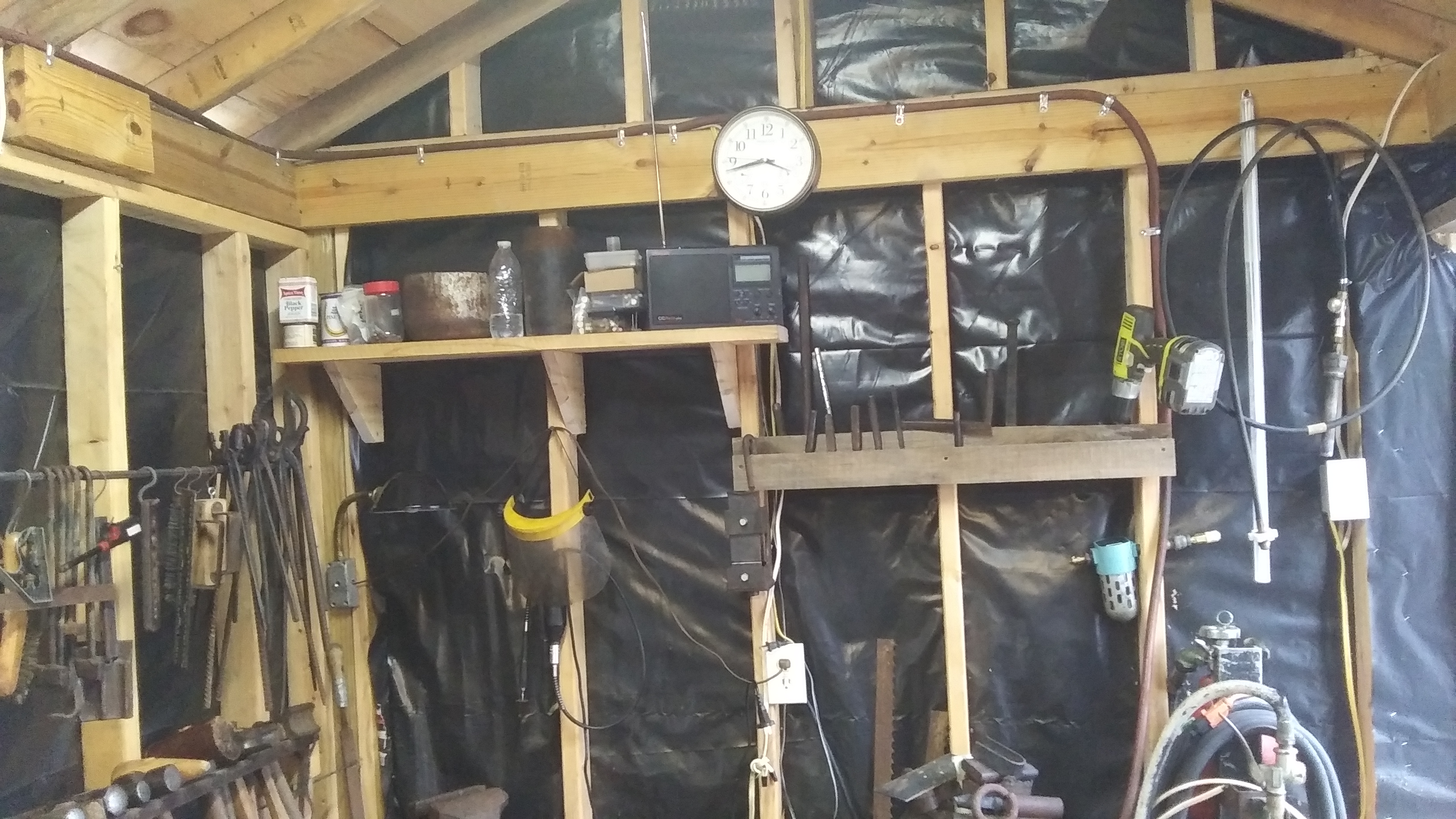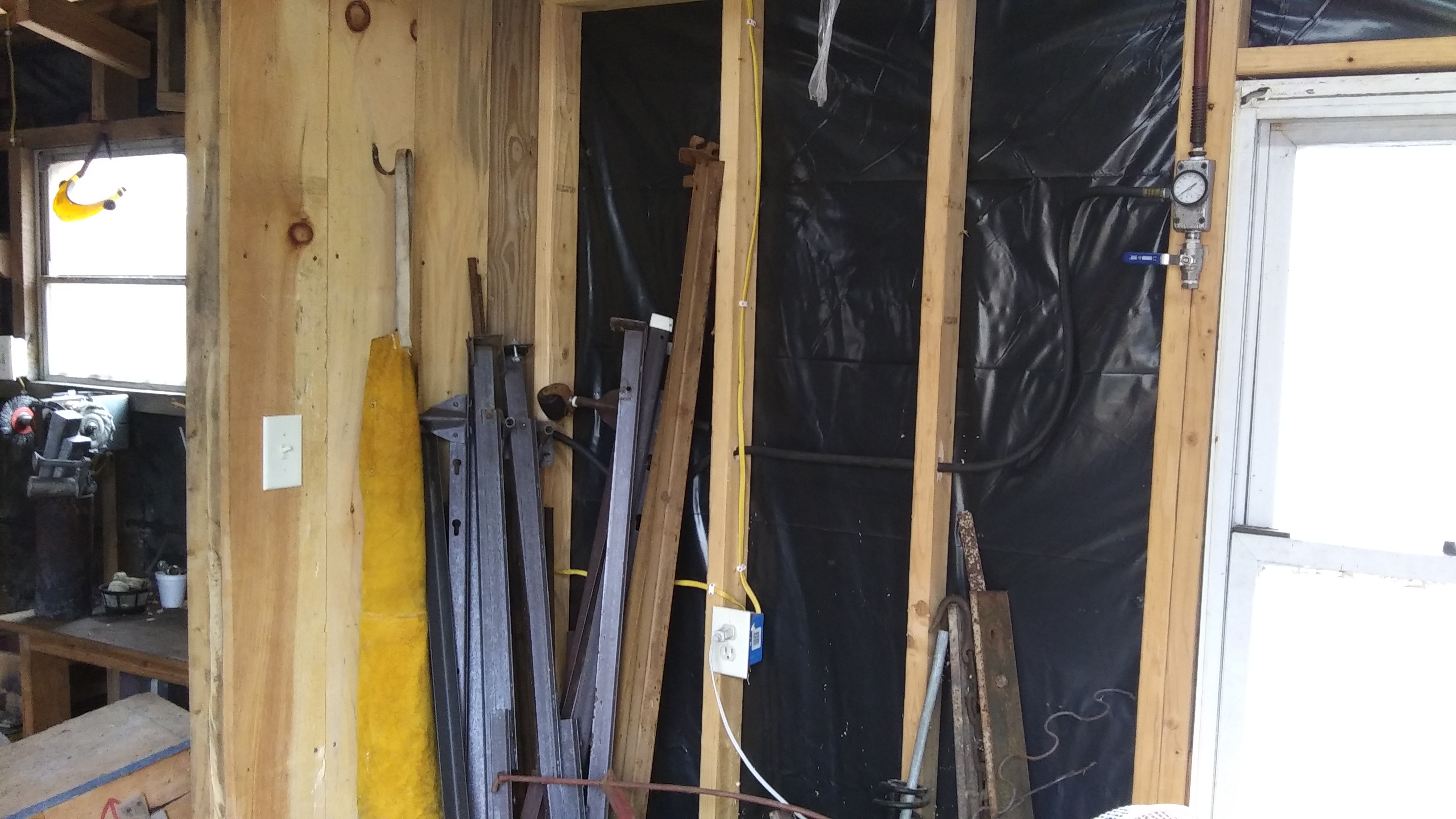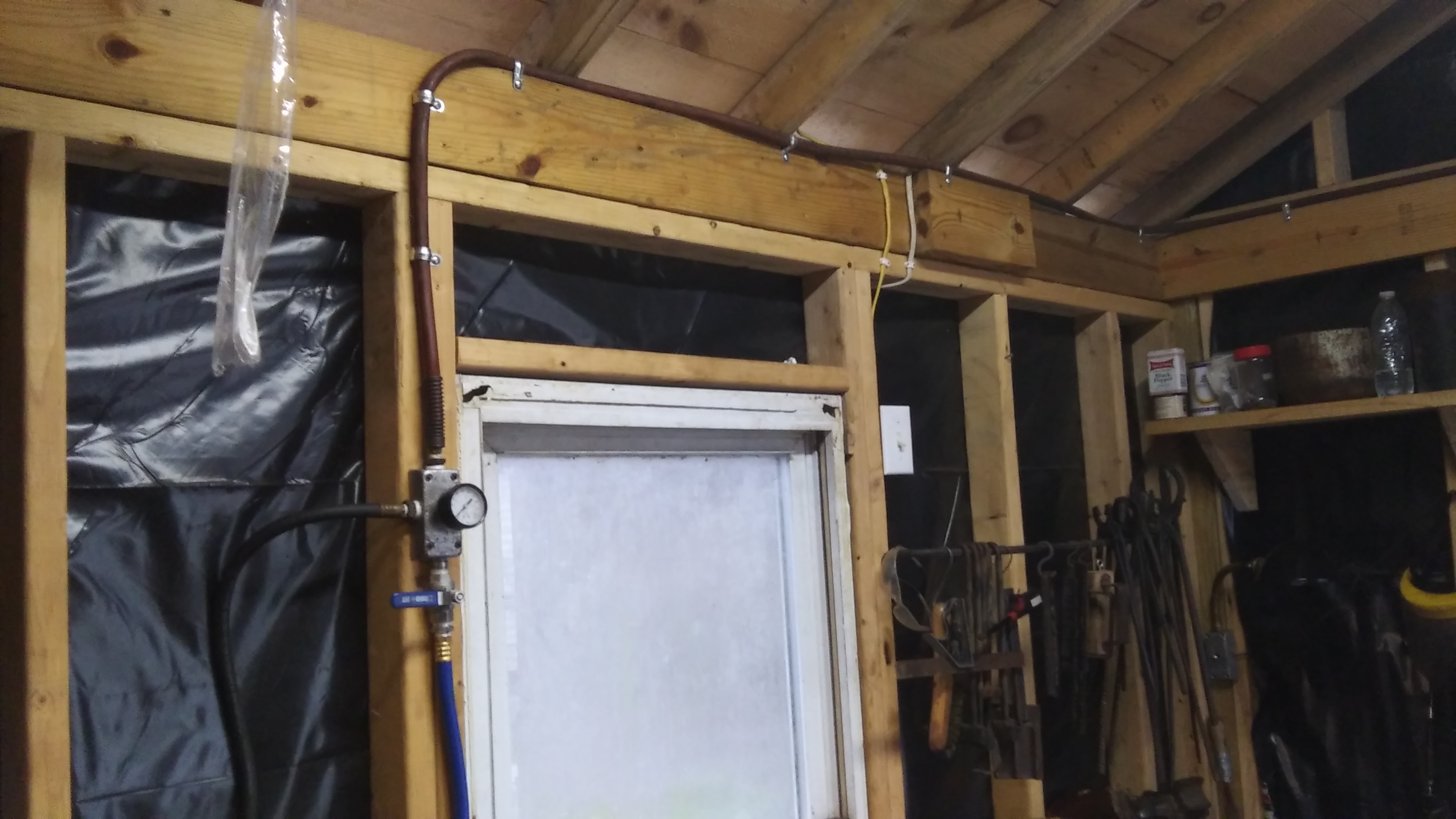 I ran out of manifold blocks, but the hose runs up and around, and will come down by the door there, and be screwed to the side of the stud there with a quick connect sticking out the side of it so I can hook up air tools like die grinders when Im working at the post vise there, and also makes easy access for the hose to run out to run my oil burner for the foundry furnace too. There's a hole in the stud already drilled through that will have a hole drilled in the manifold block for it, and that runs out to a moisture/water seperator, and from there, out to the air compressor which will be outside in a dedicated air compressor cubby/enclosure on the end of the shed. I have sound deadening boards for that also to cut down on the noise from it. too.