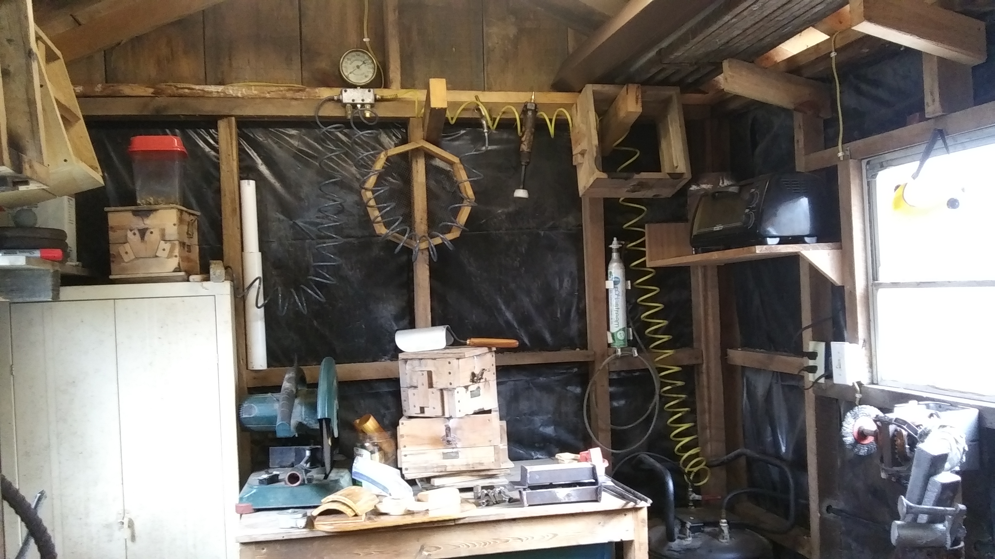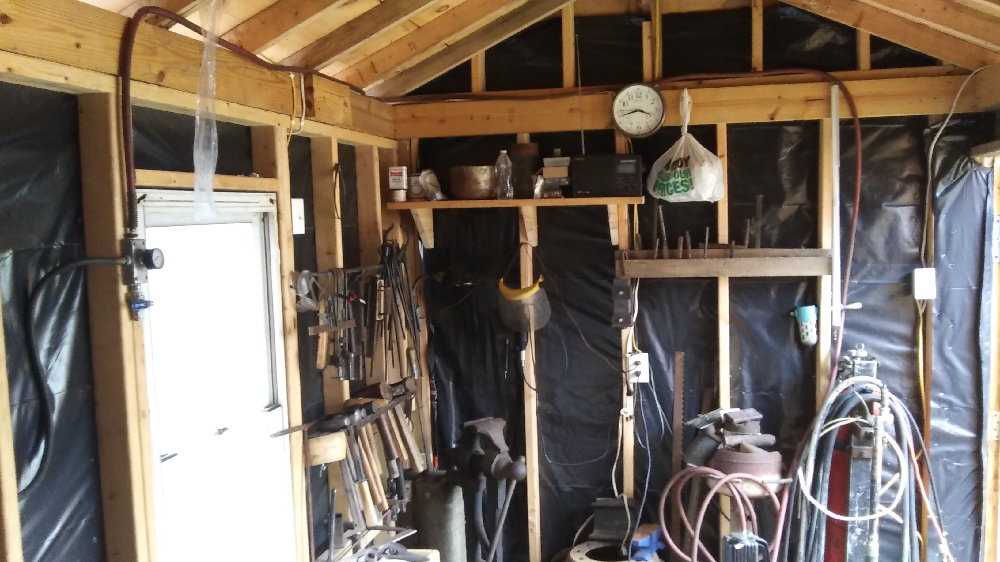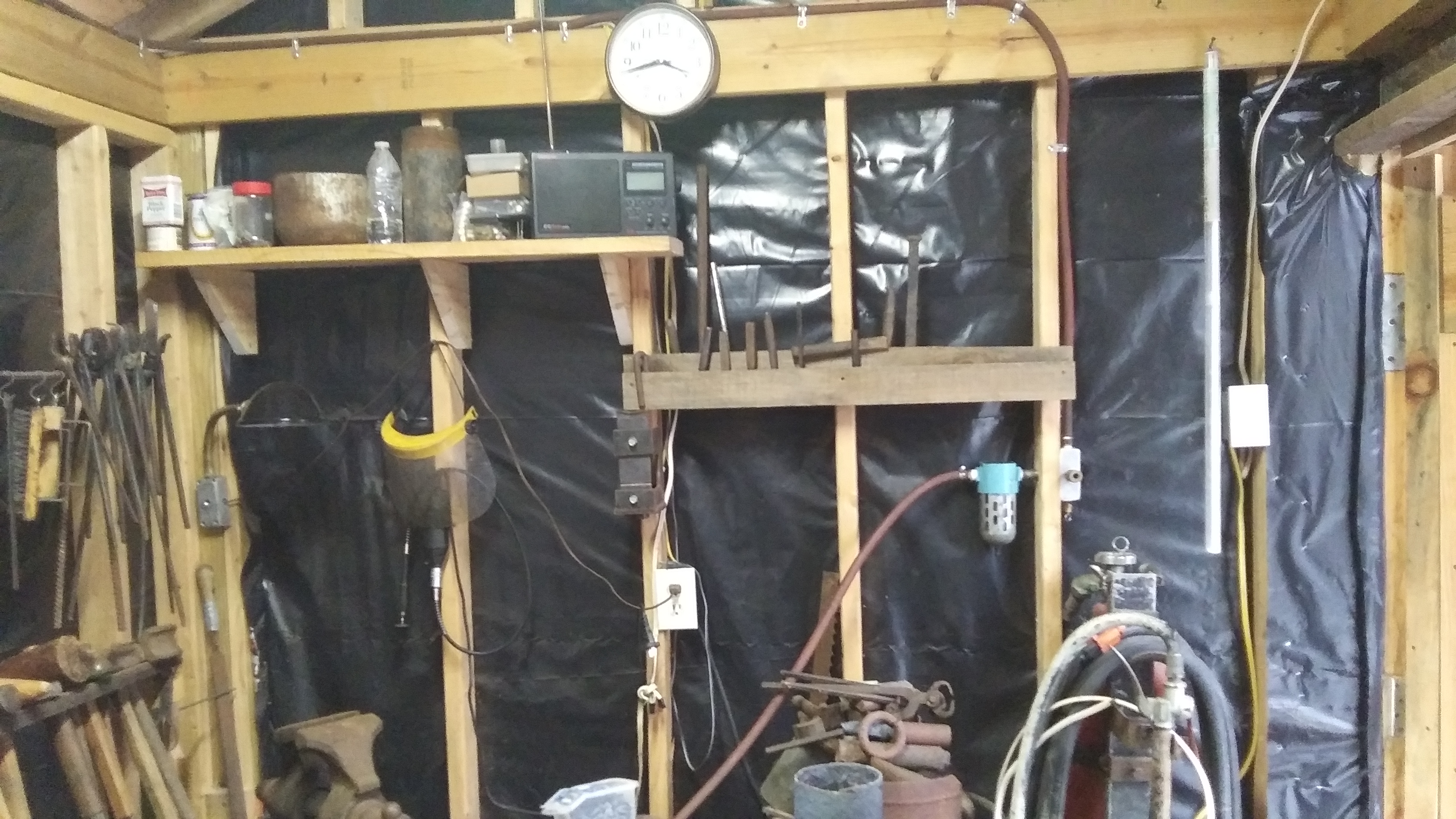 I ran out of manifold blocks, but the hose runs up and around, and will come down by the door there, and be screwed to the side of the stud there with a quick connect sticking out the side of it so I can hook up air tools like die grinders when Im working at the post vise there, and also makes easy access for the hose to run out to run my oil burner for the foundry furnace too. There's a hole in the stud already drilled through that will have a hole drilled in the manifold block for it, and that runs out to a moisture/water seperator, and from there, out to the air compressor which will be outside in a dedicated air compressor cubby/enclosure on the end of the shed. I have sound deadening boards for that also to cut down on the noise from it. too.