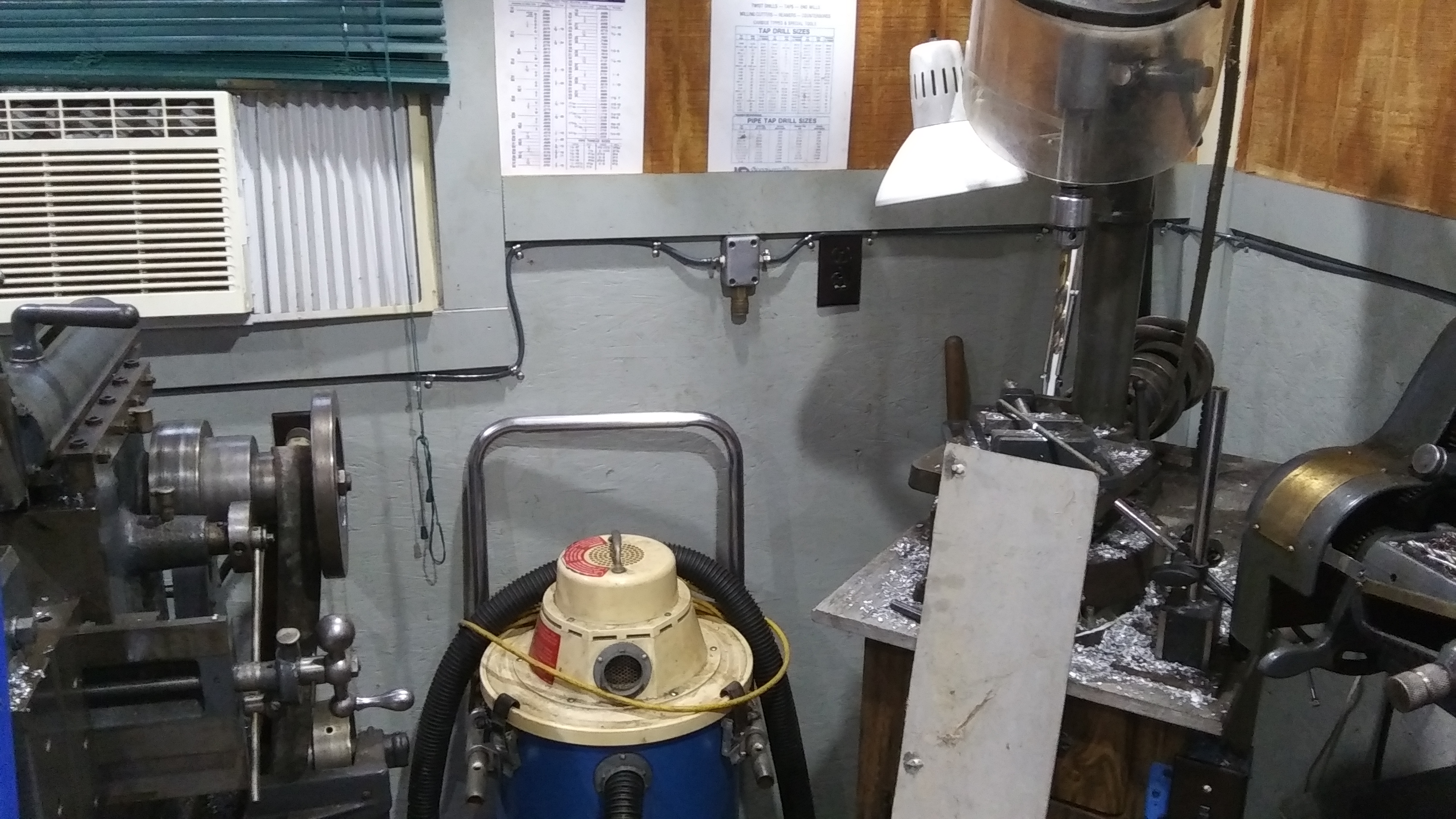 There's one next to the air compressor, which is very silent running so perfect for in the shop, one in between the shaper and drill press for blowing chips off of the shaper and out of holes while drilling, one at the end of the lathe for mist coolant for the lathe, or later on, I might want to add air over hydraulic for my hydraulic press, and finally the last one is next to the mill and set up so I can run mist coolant on the mill, and blow out chips when Im milling pockets and such.