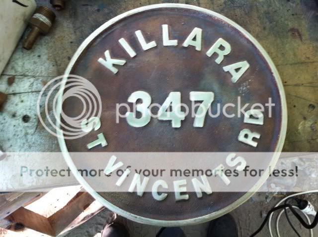 That patina didn't turn out bad at all... I'm surprised. One thing to remember, wash that piece (after you've gotten the color dark as you want) and wash it a few times with detergent to ensure no further patina reaction is occuring. Then take a block of flat wood, tape a piece of 180 grit sand paper to it, then burnish off the high points (letering and border) in a nice smooth, even vertical, or horizontal pattern so the visual is consistant. Wash it once more, gently, to remove any micro grits, bake it at 250 degrees for about 15 minutes, pull it out, set it up where you're going to paint it then coat the entire piece with a semi gloss CLEAR acrylic spray paint. She will think you bought it special ordered through the catelog
