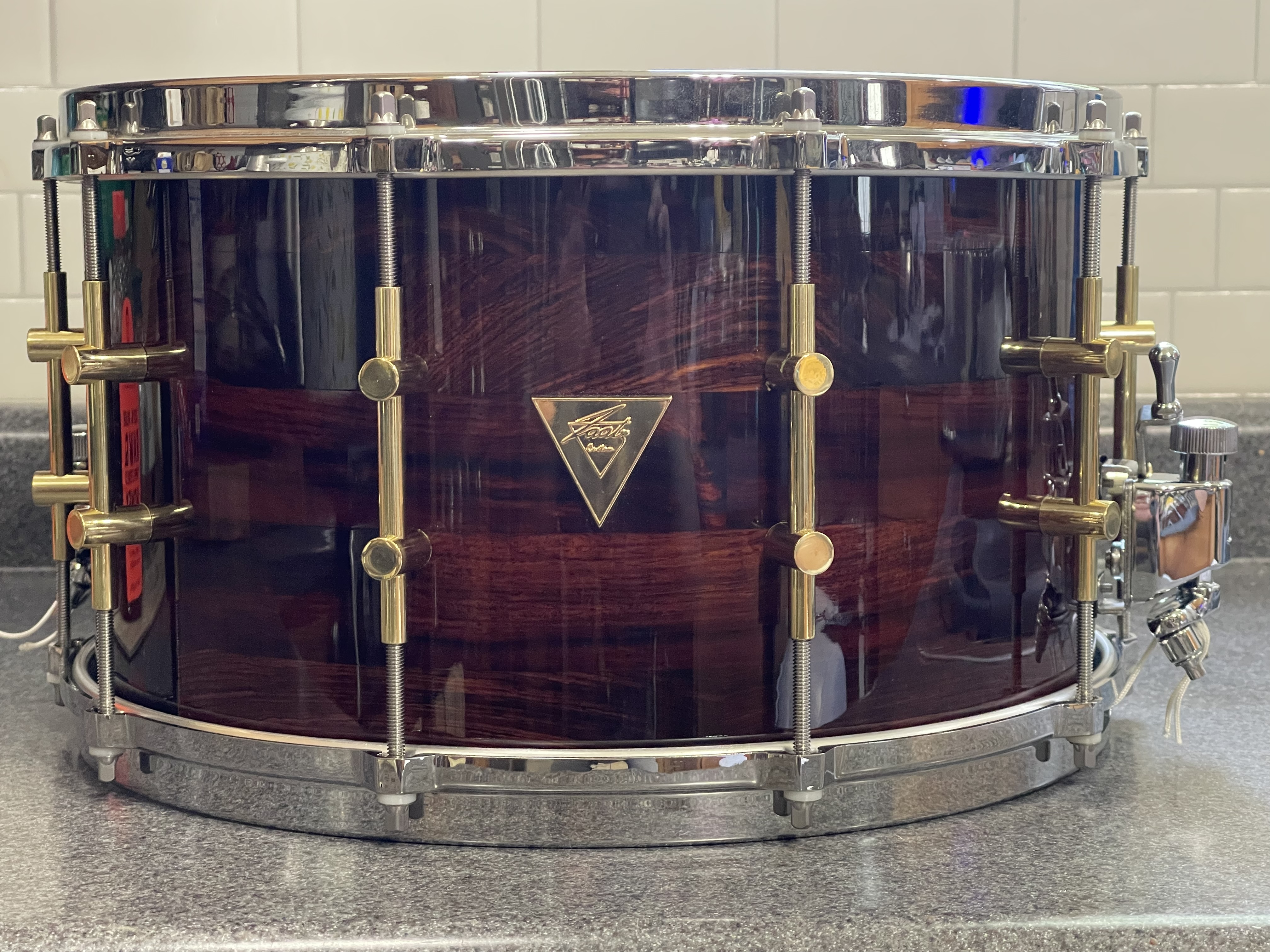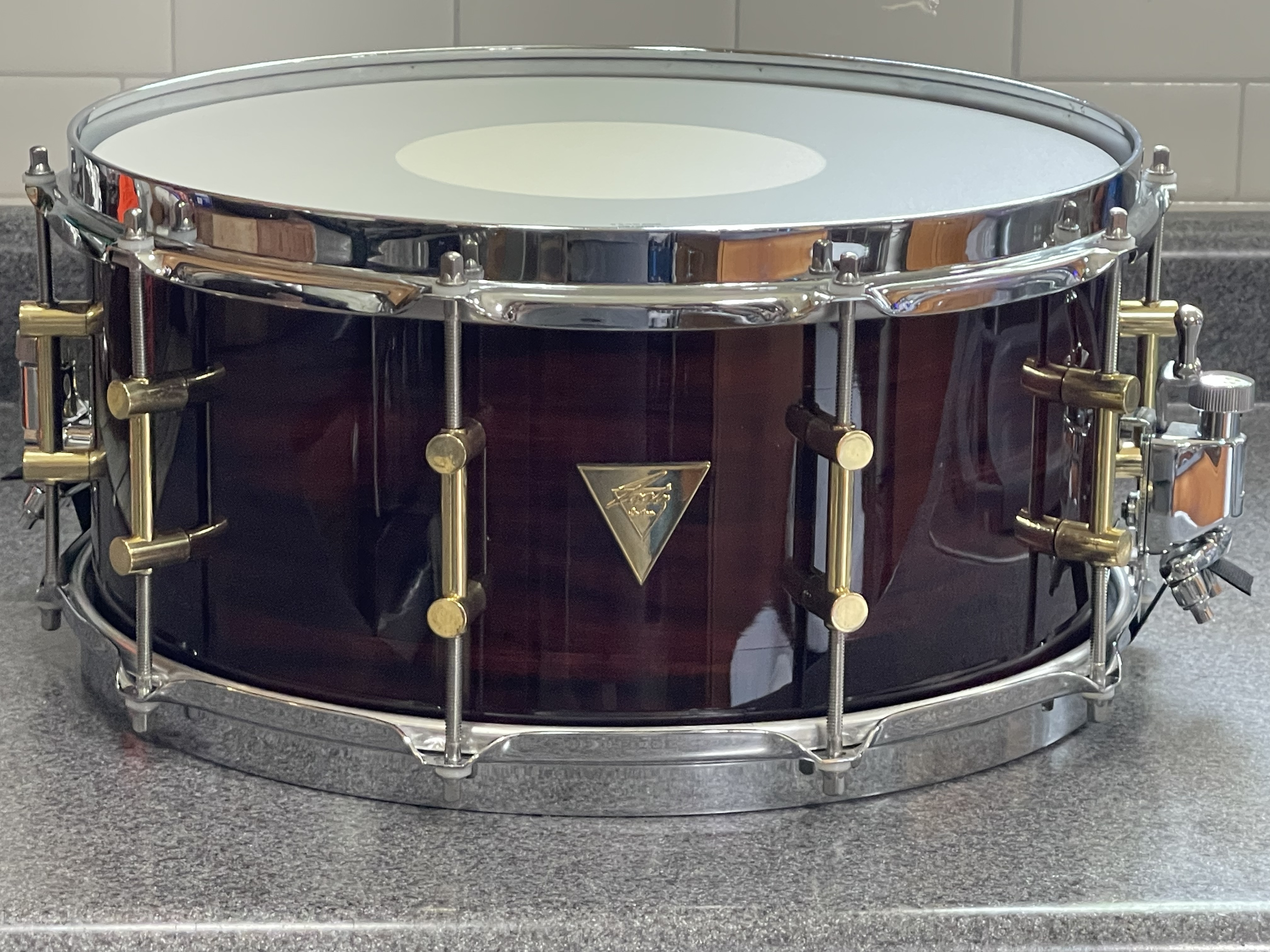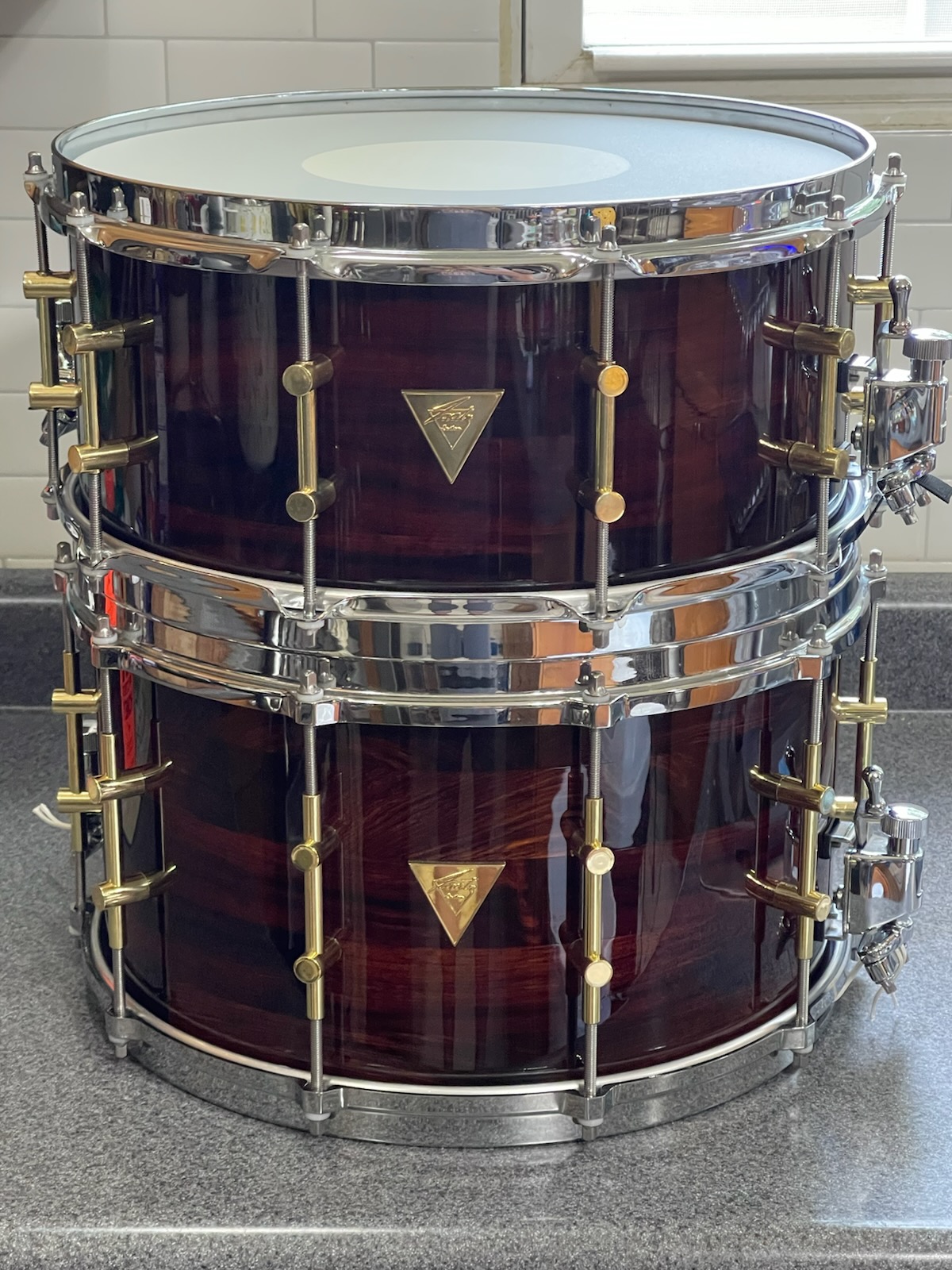 I build drums. Here's a couple of pics of the 2 cocobola snares I built. One is 8" deep, the other is 6.5". Both are 14" diameter. Cast Bronze Hoops that were bought from a place in Duluth.