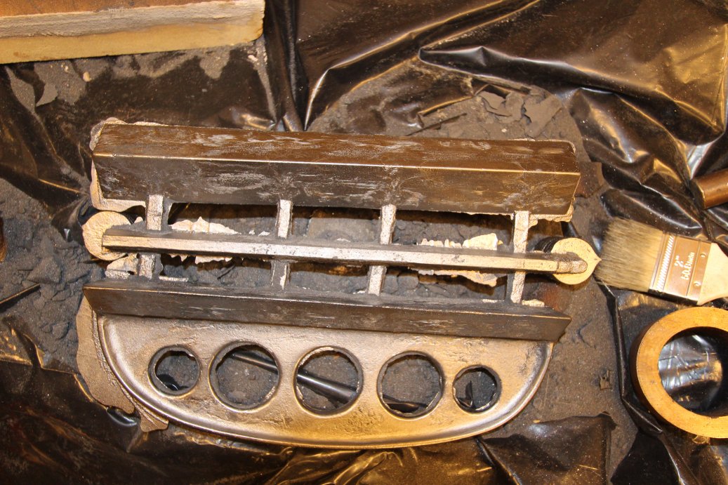 The resin bound sand is removed from the flask prior to pouring, with the cope and drag glued together with foundry adhesive, and then weighted on top.