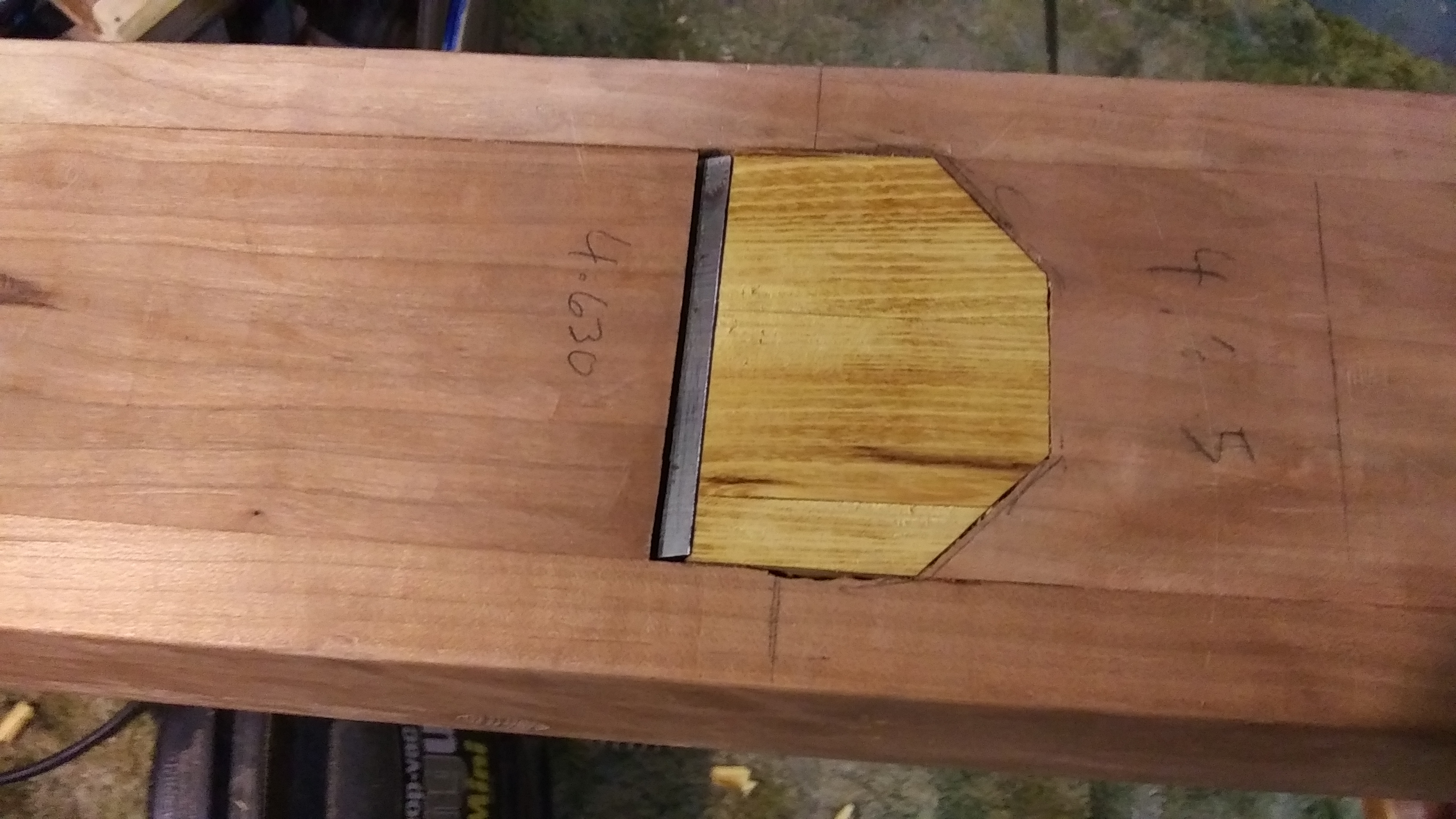 The mouth in the cooper's plane was horribly large, and was crooked also in the front, so one side of the mouth was open a bit over 1/16", and the other had over an 1/8" gap between it and the blade, so I took a piece of hedge apple/osage orange and planed it down, trued up the edges, and made a mouth closer for it. I took the plane itself to the garage for a few and used the electric router and one of the bits I just got earlier this year to cut out most of the pocket for the mouth closer to go into, then finished it up with chisels.