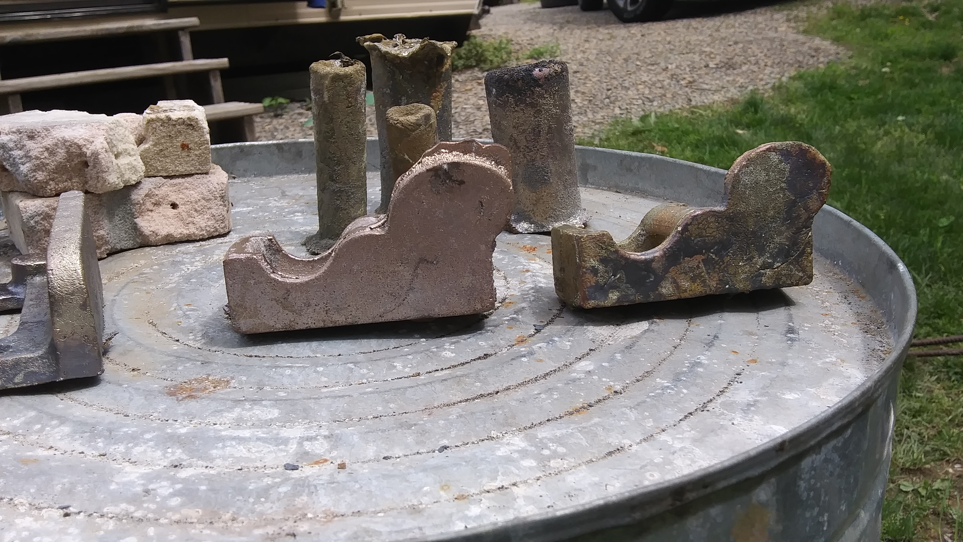 You can see across the plane that after cleaning up some of the flashing that flowed around the core, there was virtually no difference between the bridge pin, and the outside of the casting. The fence pattern had some alphabet pasta letters on it, just trying to see how they would pull from the sand, and they pulled perfectly fine.