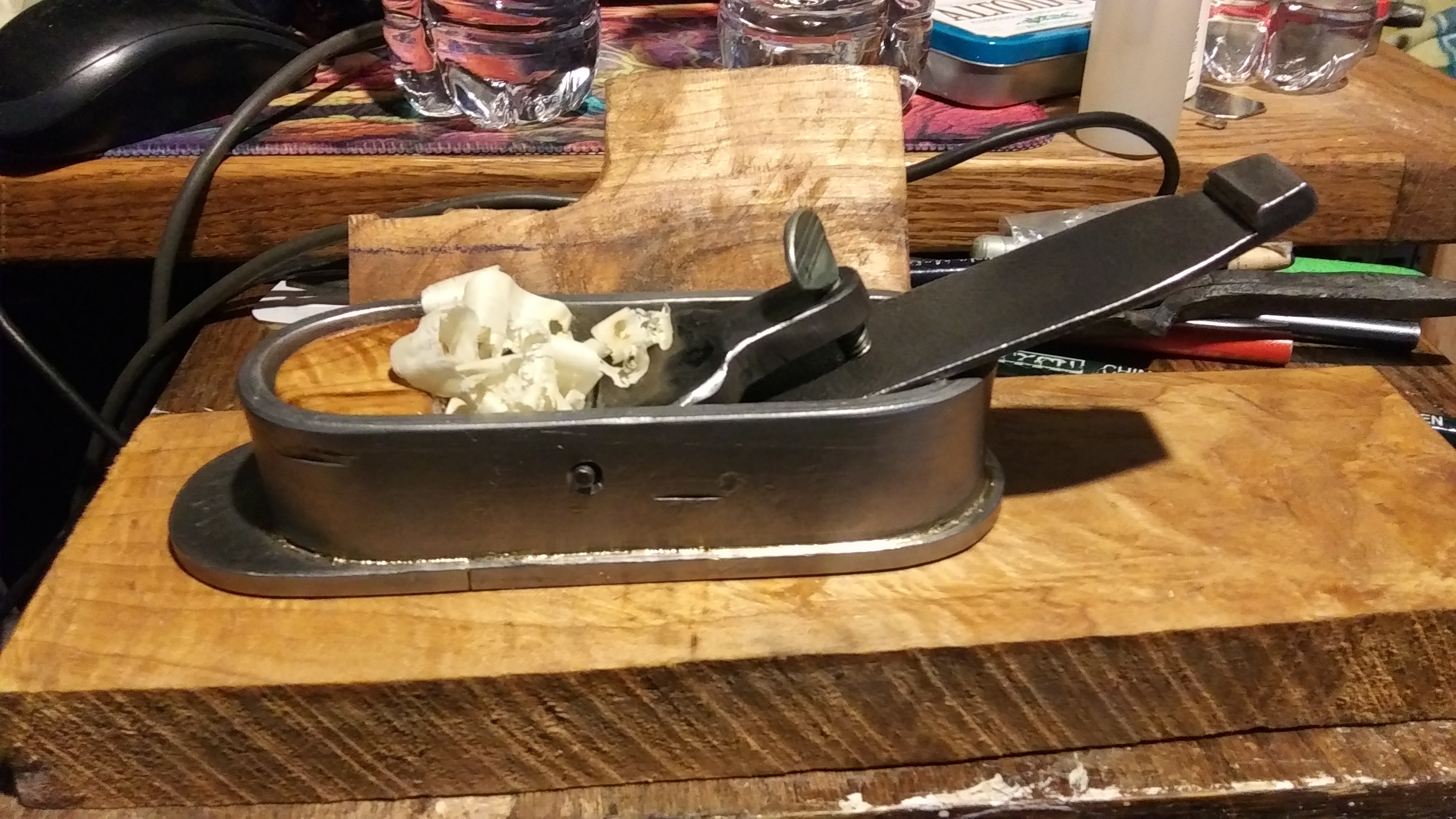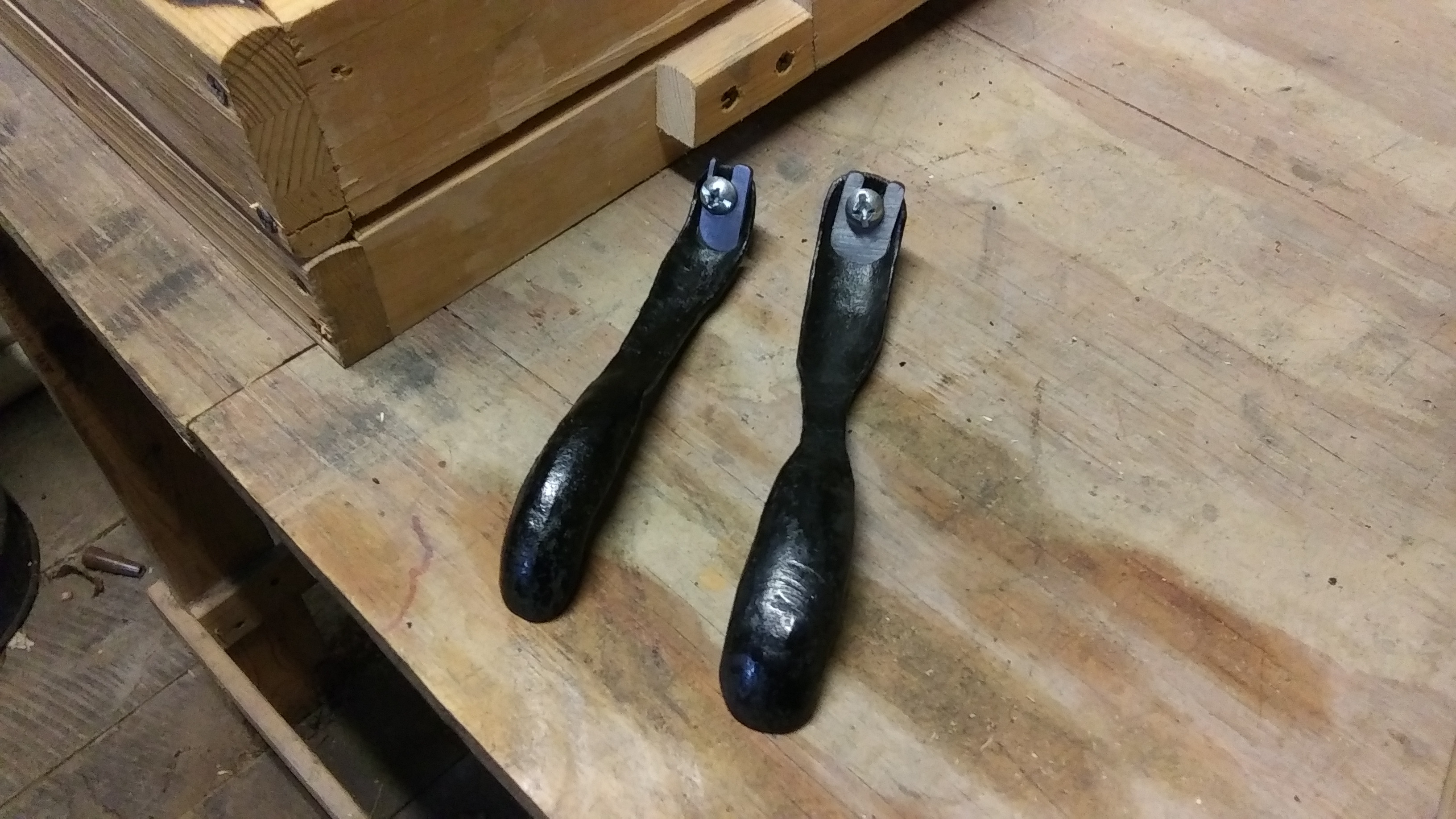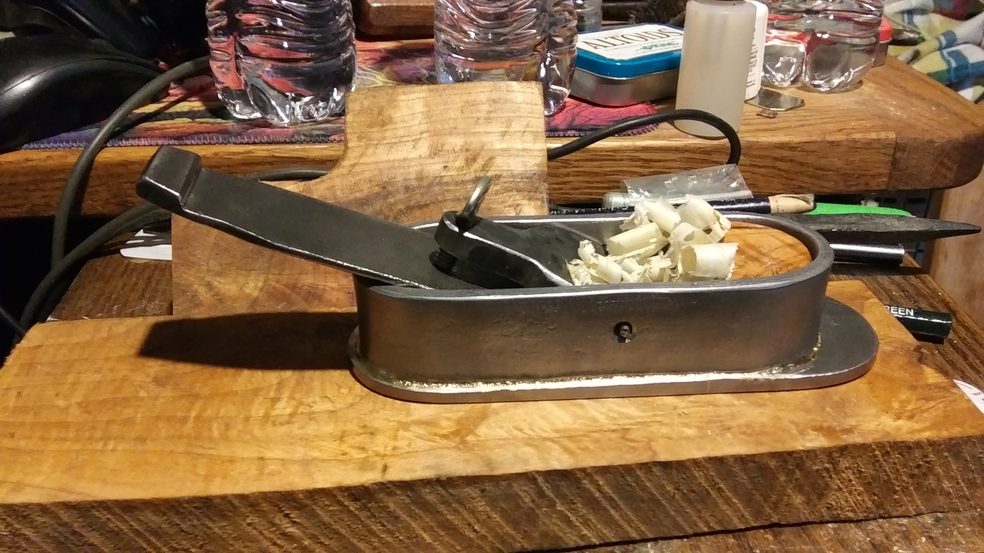 I was wanting one with a 3/4" radius, and one with a 1" radius, which were the same sizes I use for my swages/forms that I use to make my gouges usually. The shape is nothing but a bow tie shape that has been made into a double ended spoon, so the offcut pieces from the side planes were hammered out and turned into those planes, lol. The mouths were chain drilled and then filed out to open them up, then drilled for 1/4"-20 threads to hold the blades in. The drill bit wandered pretty badly on the one, but it doesnt hurt the functionality of it really.