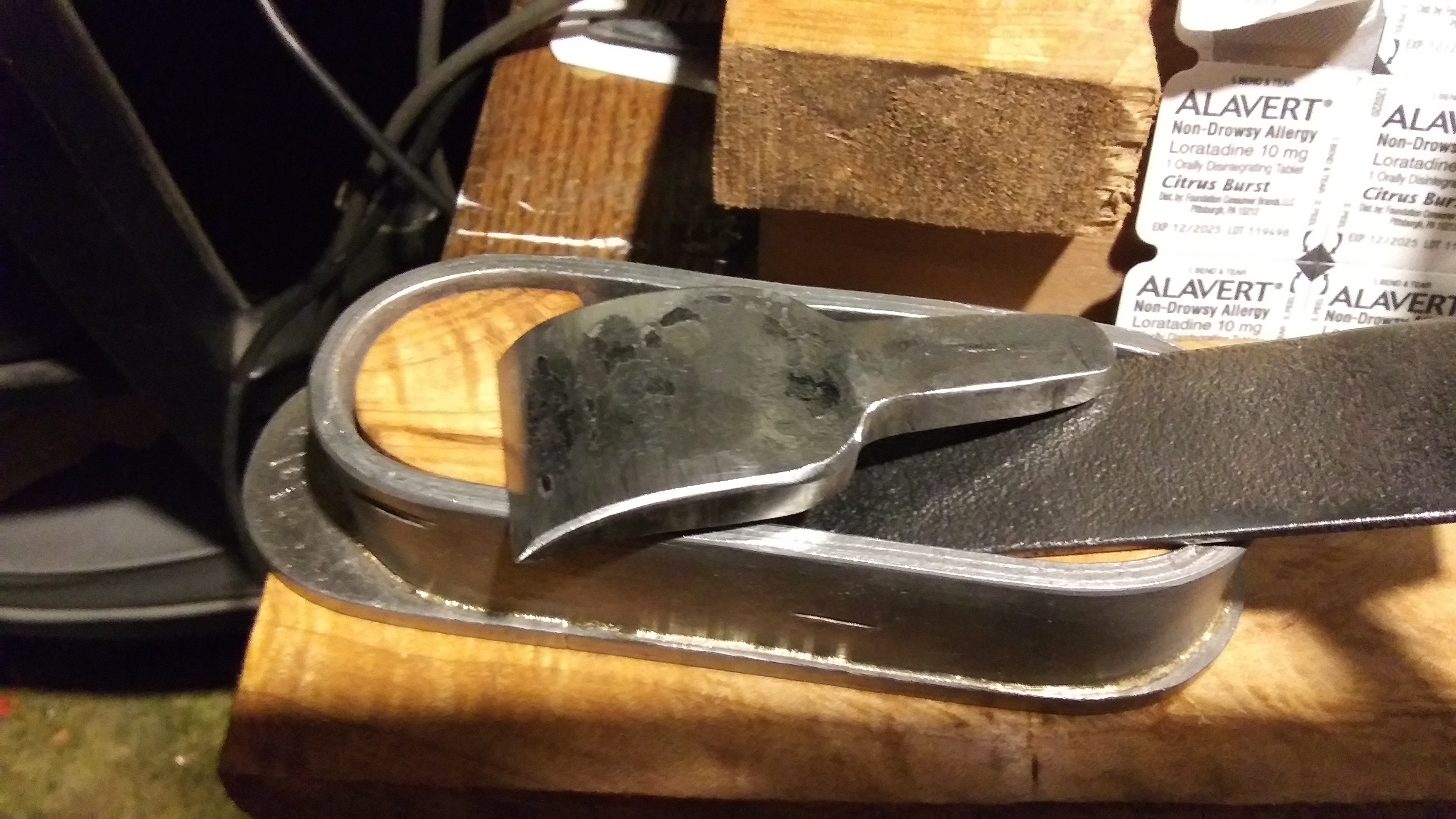 I went back out to the forge and found a piece of 1/2" x 1 1/2" x 2" long flat bar off-cut in the scrap bucket, so I stuck it in the forge and started hammering it out to forge out the lever cap for it since I was wanting the lever cap vs a wedge this time. I hammered it down to make it a bit oversize and made it a hair over 3/8" thick, then fullered down and drew it out so the stem was around 5/8" wide, and looked long enough. I then stuck it on the side of the anvil and hammered down on the top corner to drive it in on itself and create a tapered edge. I took that over the horn and just pounded it over slightly to cause it to bend and arch slightly.