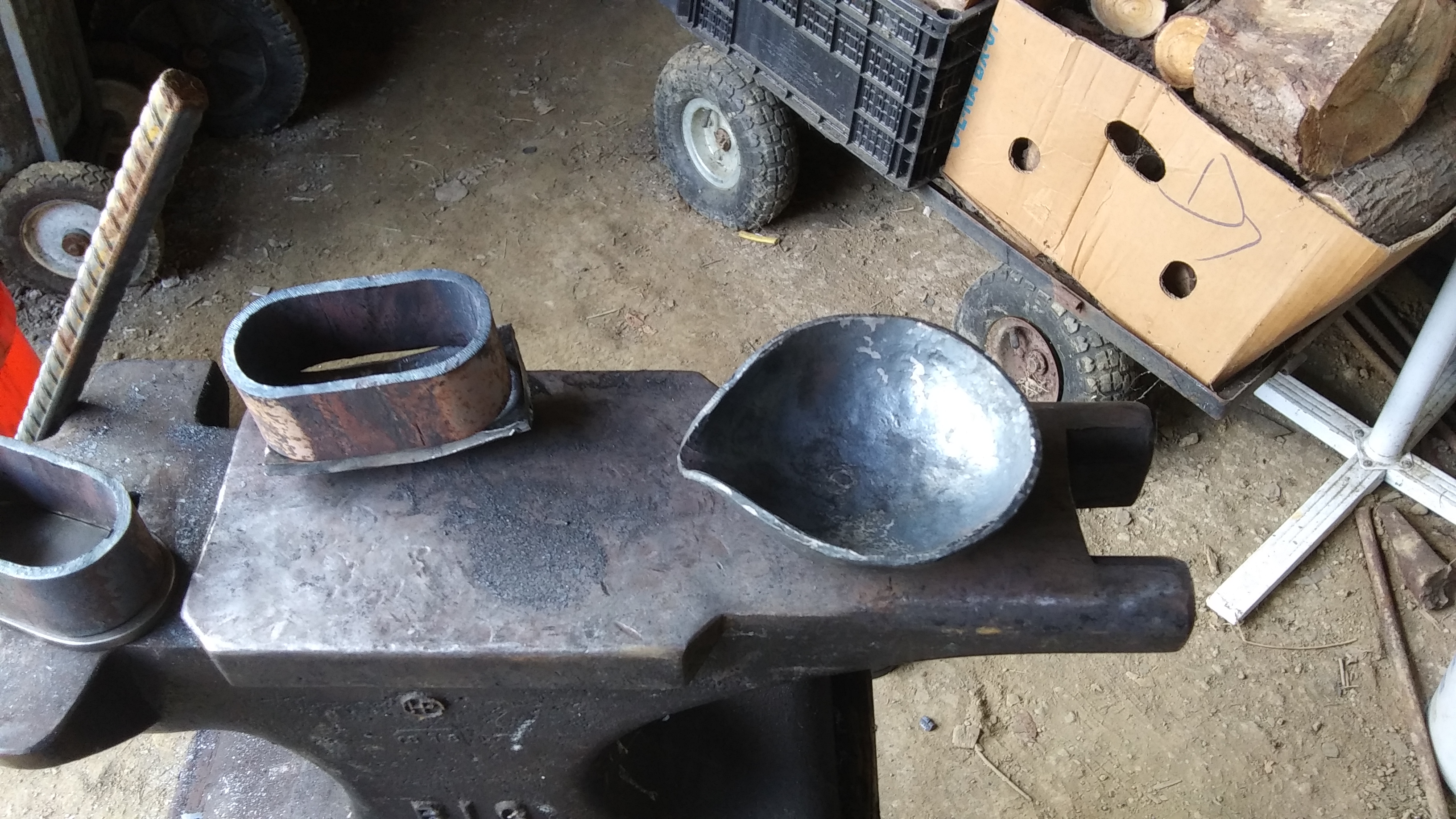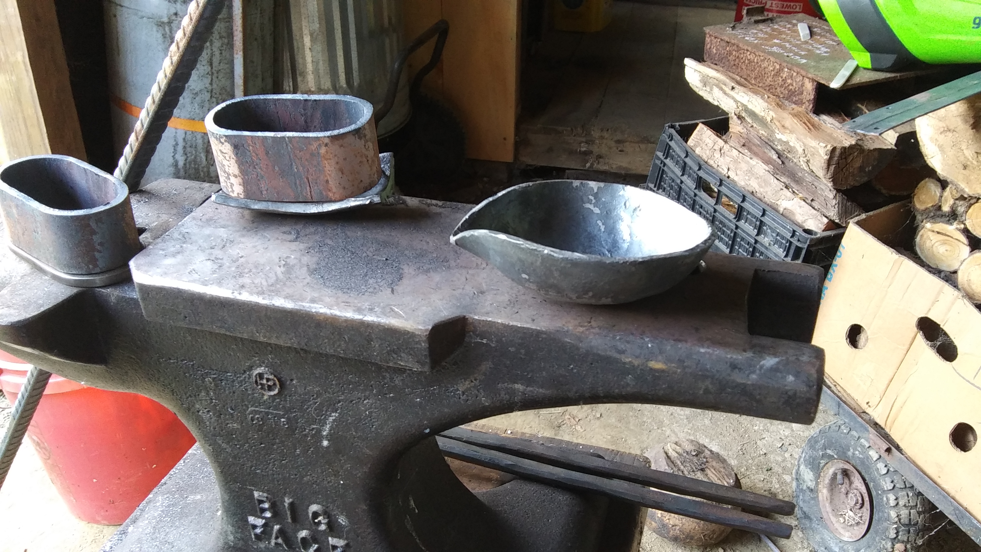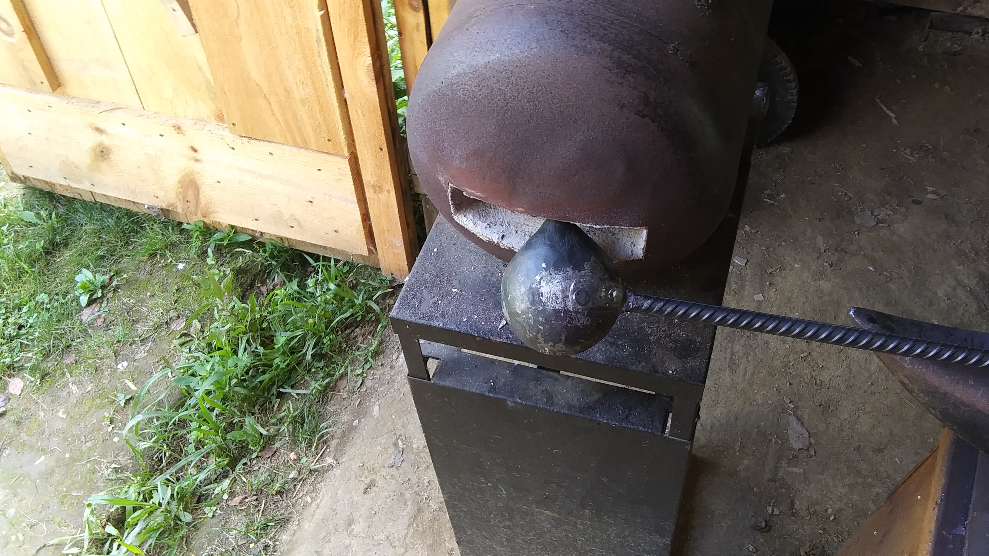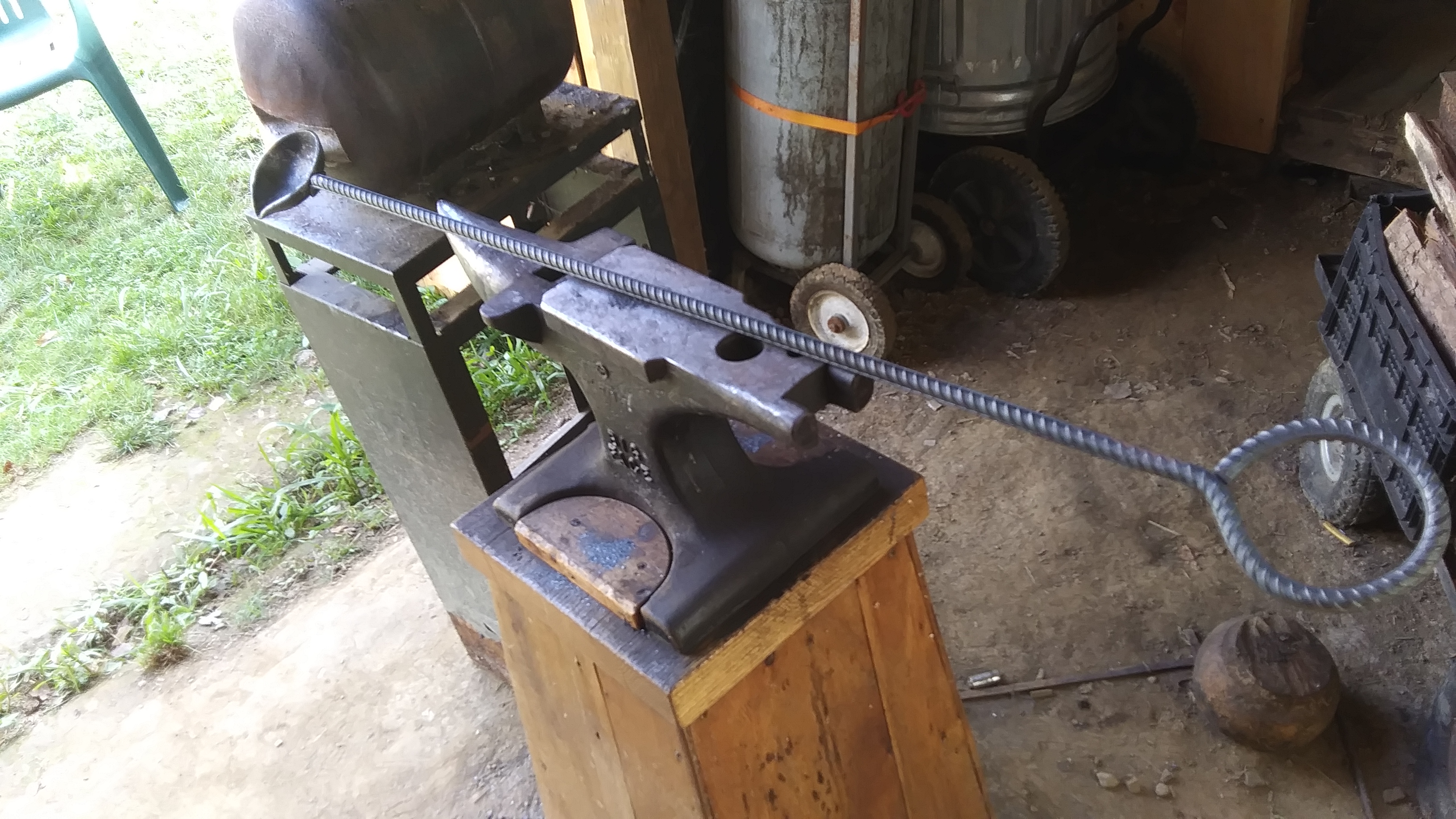 I need to hammer out a new drossing scoop, the one Ive been using is a bit too short and I keep getting the hands a bit too close and a bit too toasty from the furnace's radiant heat, so Ill just make up a new one that has a much larger scoop and alot longer handle on it. I like using rebar for foundry tools because it's cheap, and you get a good grip on the stuff with the thick leather welding gloves on, lol.