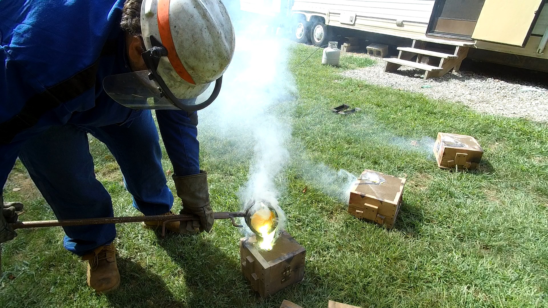 That is how badly brass fumes when pouring usually, when it's hot enough to actually fill a mold. It really isnt glowing yellow hot like that, the zinc oxide coming off of the brass tends to ignite on contact with the air and burns with a bright gold color.