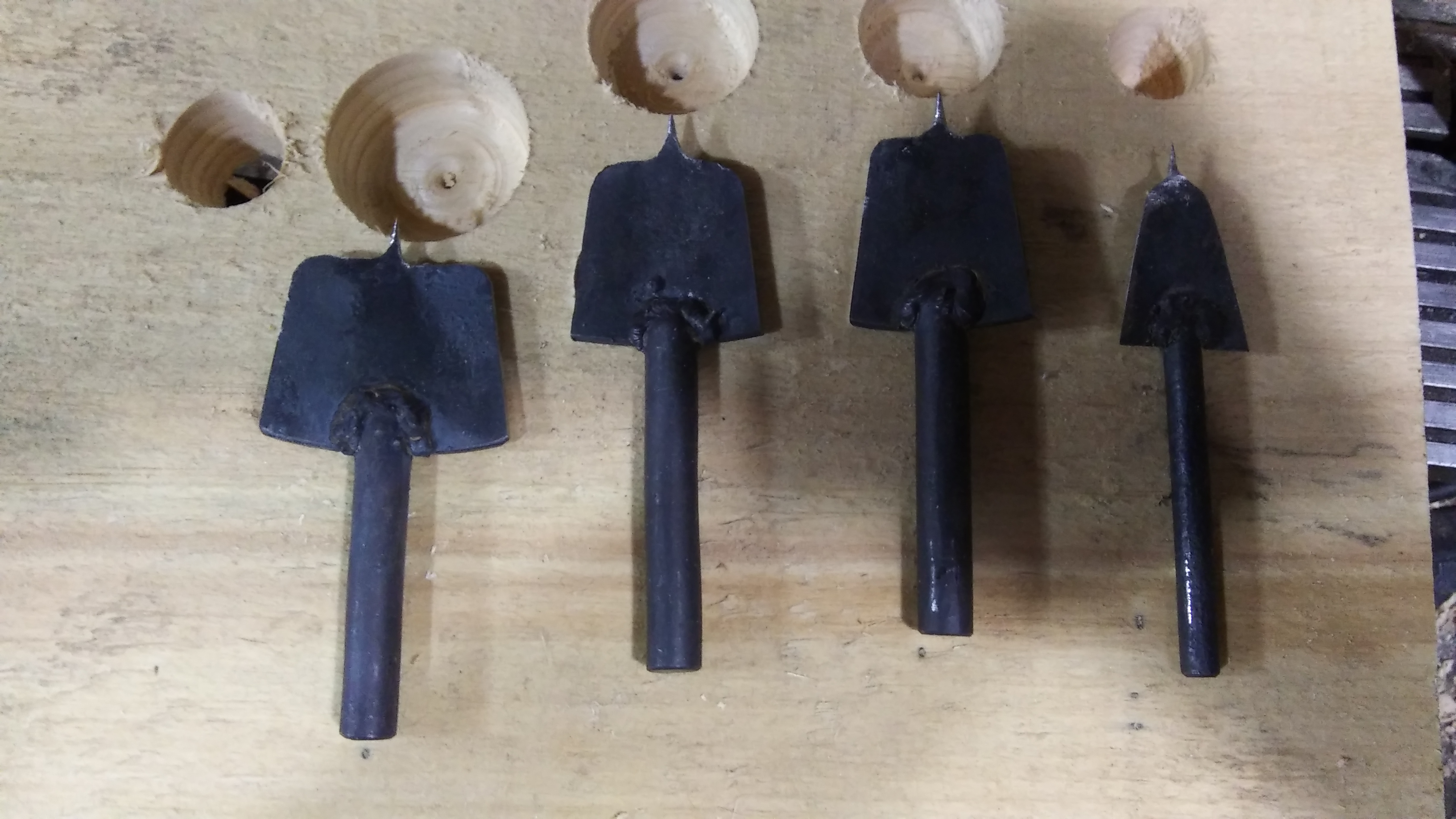 Up till now, for the tapered holes, where you would want a hollow cast into a part without making a seperate core/core print, I would cut it out with a jigsaw and try to cut draft into it with my chisels/whittling knife, which always looks pretty bad. Recently I got a spindle sander, which works for larger bores, but anything below 2", it can get interesting to cut it out and sand it, so I was playing with the idea of making some tapered drill bits that would drill through the pattern, and leave a tapered bore, all in one step, lol. Ive made homemade spade bits before and they're pretty easy to make, so I figured I'd go with that style. This is what came out of the idea. These bits are all made from coil spring for the shanks so the drill chuck doesnt tear it up, and spade parts are made from bed frame as usual, lol. They were all stuck in the forge to heat to red hot and left to cool slowly in the forge to stress relieve them and make the weld joint much much stronger/less brittle, and so I could machine them on the lathe to size/shape.
