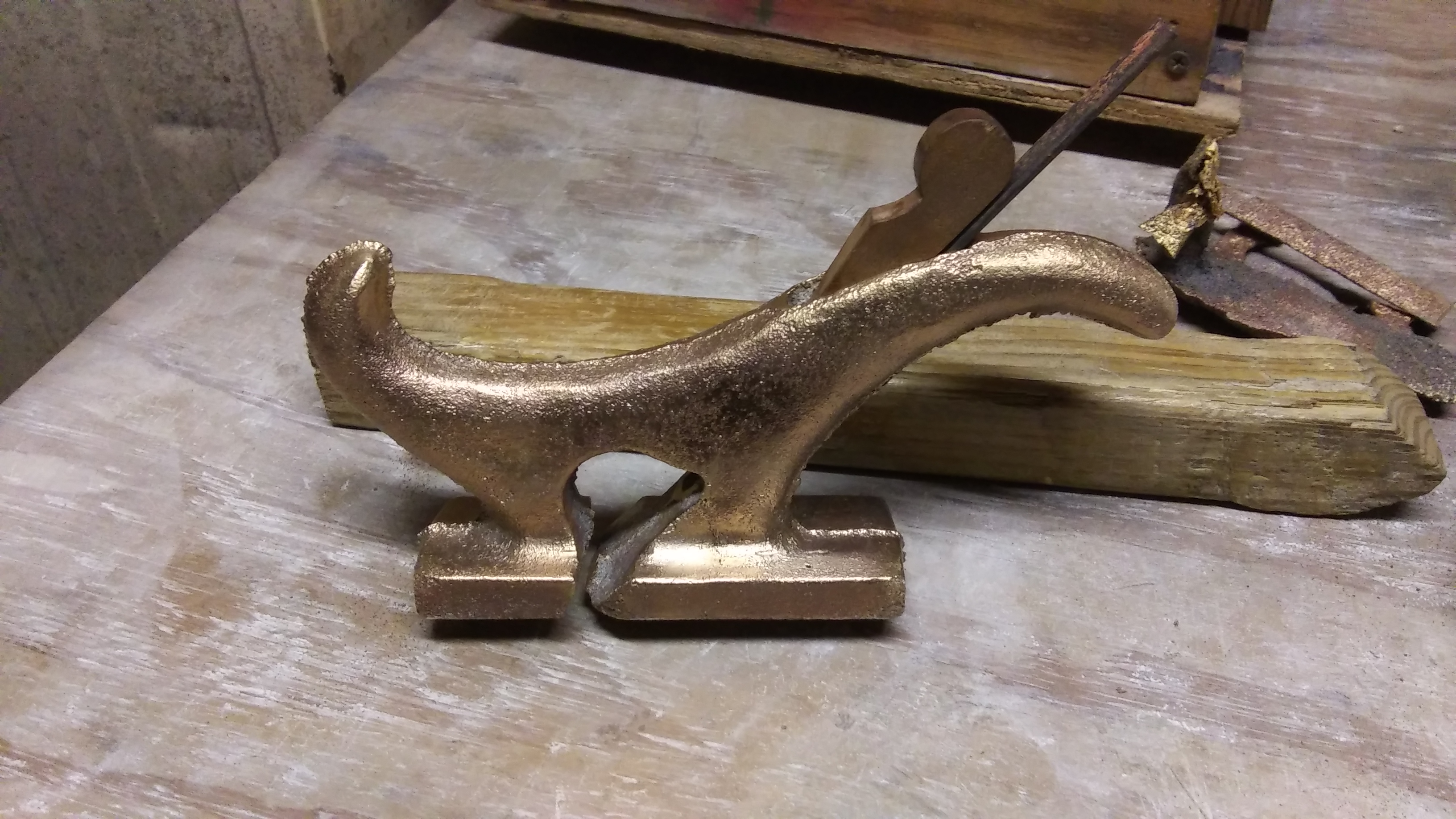 It should work pretty well, but now for the long part of cleaning it all up with a file and cleaning up the mouth. The surface finish isnt bad at all, but the draft from the corebox made it at a slight skew angle for the bed, and I didnt even think about that, just grabbed it out of the toaster oven and put it into the casting, so Ill have to clean that up. Being done in aluminum bronze, it's going to be interesting to say the least to clean that up, lol. Either way, it is done and I have my T rabbet plane now.