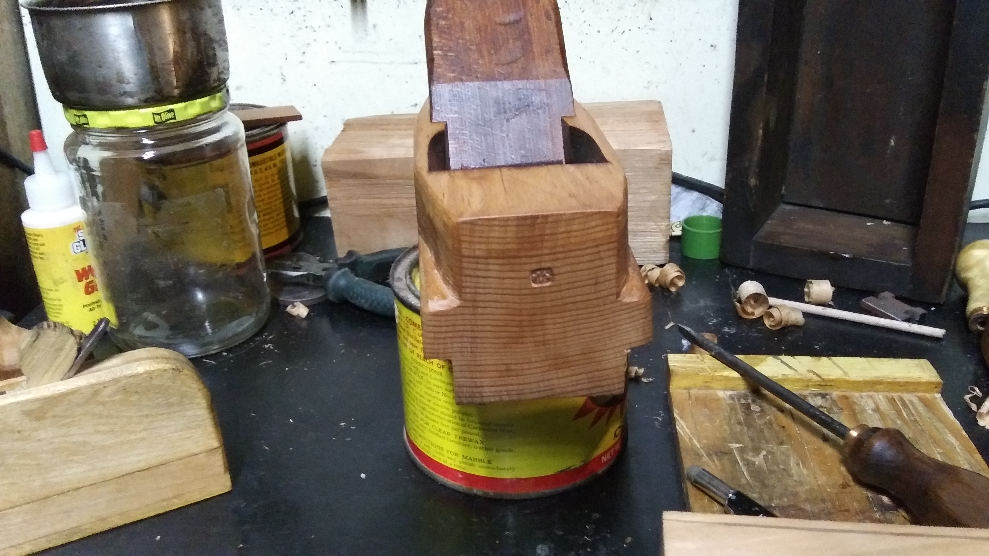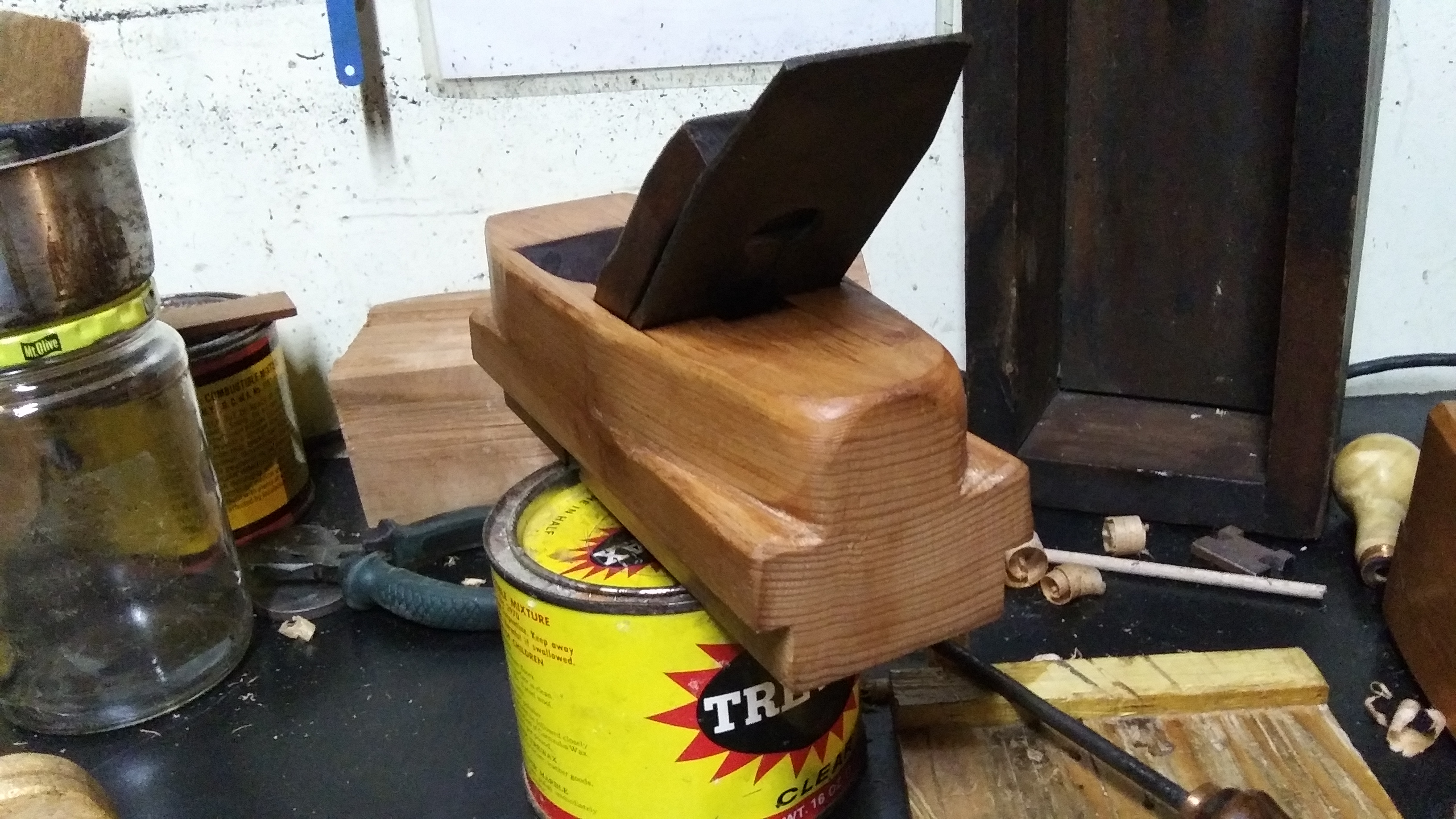 Oh yea, I did finish this one. It is all carved and shaped. I just sat down the other night and started whittling on it to shape the back end and start to shape it, then using scrapers to smooth everything out. It has a 2 1/4" wide blade, which Ive since cleaned up and started lapping the blade to flatten it, and to try to clean up the rust/pitting on it, but I think once I go to sharpen i on the sharpener, it should clean up pretty easily really. The blade is wrought iron with forge welded face on it, and where the chip breaker was on it, it has a tiny bit of pitting on it near the edge, which is dissappearing pretty quickly when lapping, and isnt very deep at all. All that's left to do on it is just to sharpen it now.