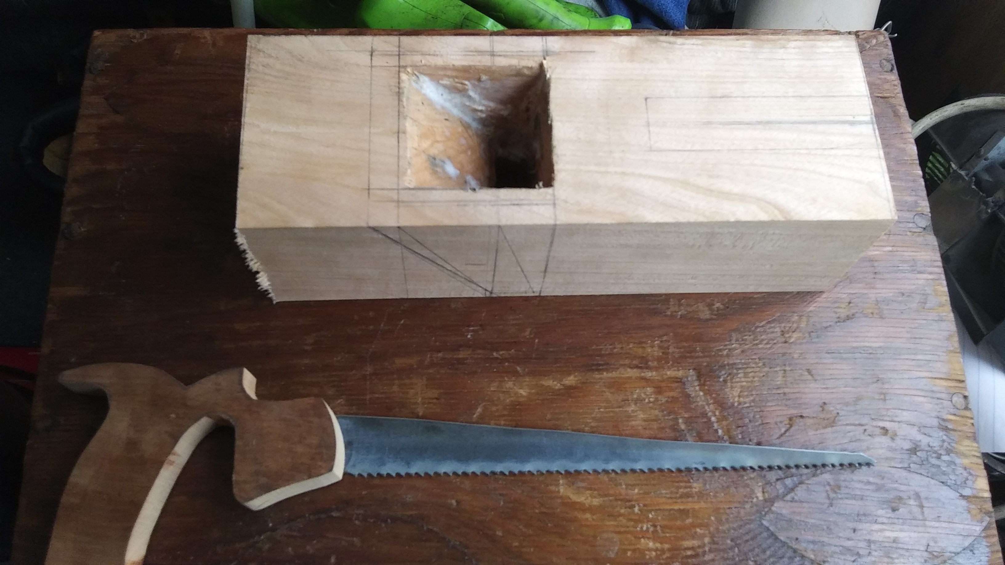 I chiseled out and put a pocket in the body of the plane using some forsner bits and chisels, that way I could shape it exactly how I wanted it. I then recessed the handle/tote down inside the body of the plane, then did the same to the handle/tote pattern and created a tenon on the bottom of the handle, that way it would fit just right into that pocket.